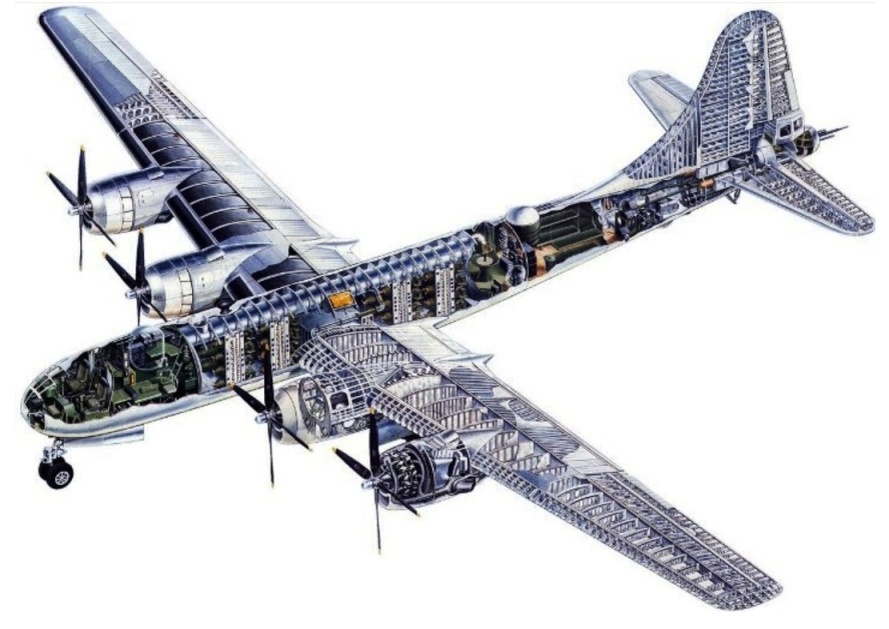 Самолет Боинг В-29 «Суперфортресс» - тяжелый четырехмоторный бомбардировщик. Конструктивно представлял собой цельнометаллический свободнонесущий моноплан со среднерасположенным крылом и однокилевым оперением.