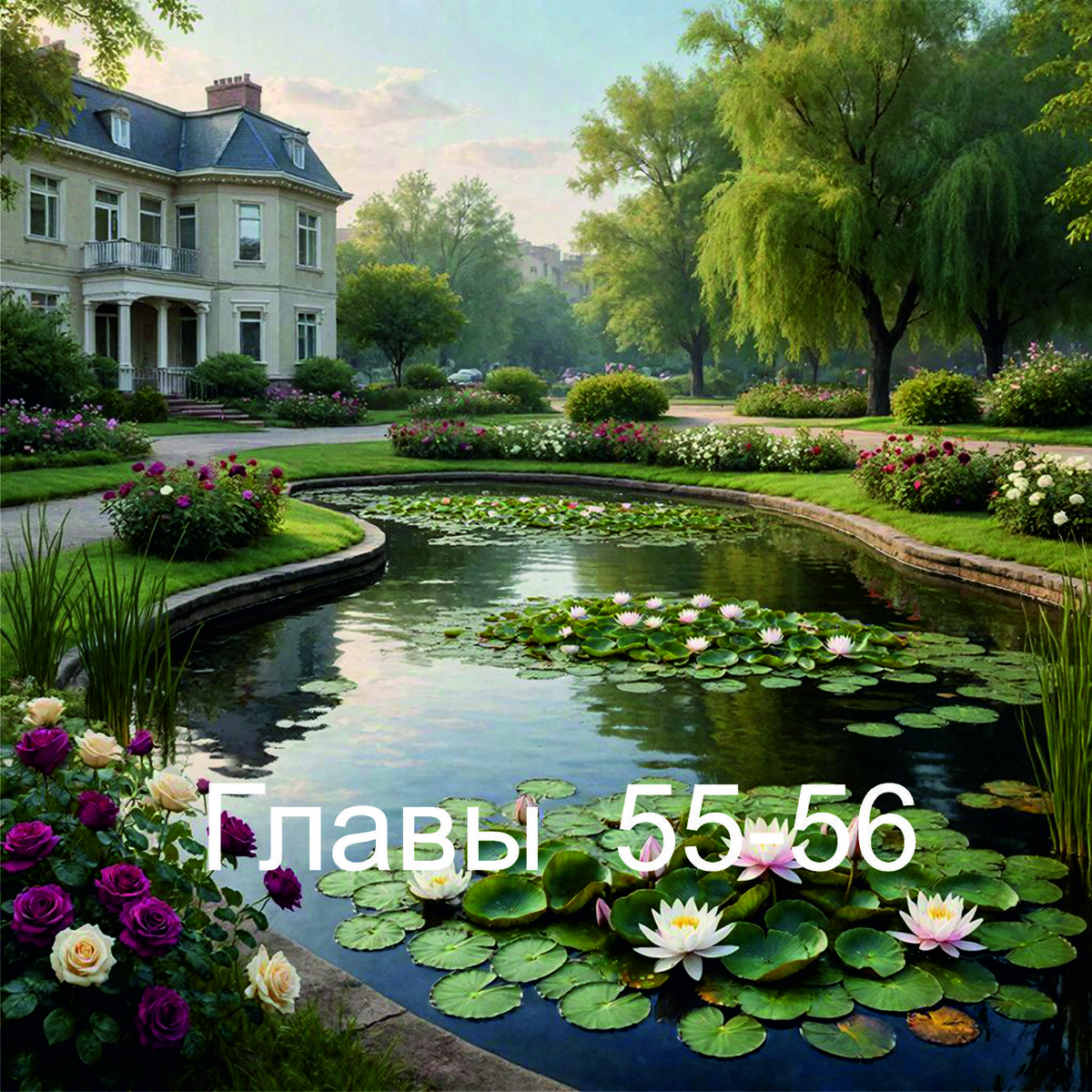 Прямо перед окном, посреди аккуратно подстриженного газона, в лучах едва взошедшего над горизонтом солнца блестело зеркало пруда. На его поверхности, среди огромных тёмно-зелёных листьев, распустились белоснежные короны водных лилий, а на противоположном берегу, склонив к самой воде свои тонкие ветви, притаилась старая плакучая ива.