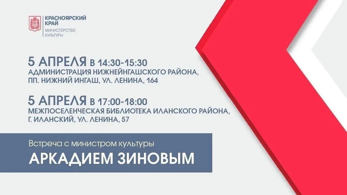 5 апреля министр культуры Красноярского края Аркадий Зинов проведет встречу с жителями курируемого им Иланско-Нижнеингашского муниципального
