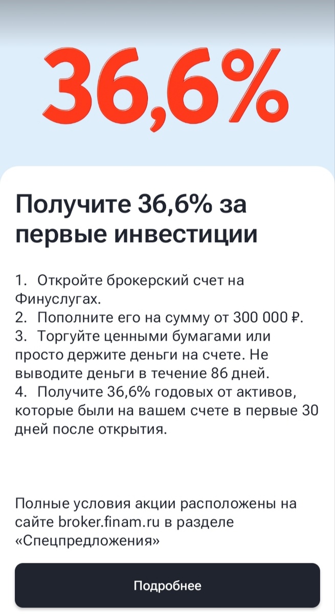 В один прекрасный день по привычке просматривала предложения. И тут взгляд зацепился за преложения от финуслуг. Маркетплейс предлагал разместить деньги на брокерском счете аж по 36,6% годовых. Ого!