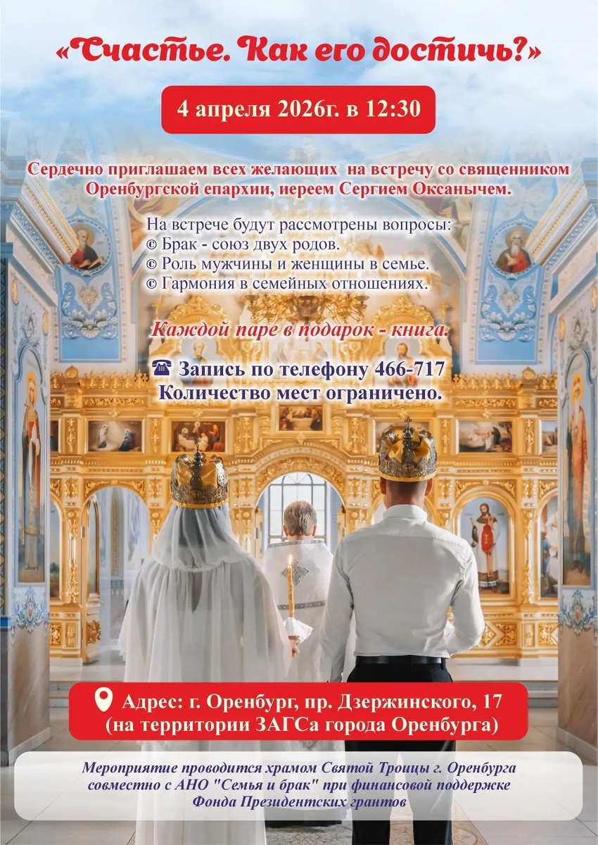 Как его достичь?" Сердечно приглашаем всех желающих на встречу со священником Оренбургской епархии, иереем Сергием Оксанычем. ⏰4 апреля 2026 года в 12:30 ч. На встрече будут рассмотрены вопросы: 🕊 Брак - союз двух родов. 🕊 Роль мужчины и женщины в семье. 🕊 Гармония в семейных отношениях. 🎁Каждому участнику в подарок - книга. ☎Запись по телефону 466-717 ⚡Количество мест ограничено. 📍Адрес: г. Оренбург, пр. Дзержинского, 17 (на территории ЗАГСа г. Оренбурга) Мероприятие проводится в рамках проекта "Семья как ценность" при поддержке Фонда президентских грантов. Читайте нас в МАХ Дела Церкви 56 Читайте нас в MAX