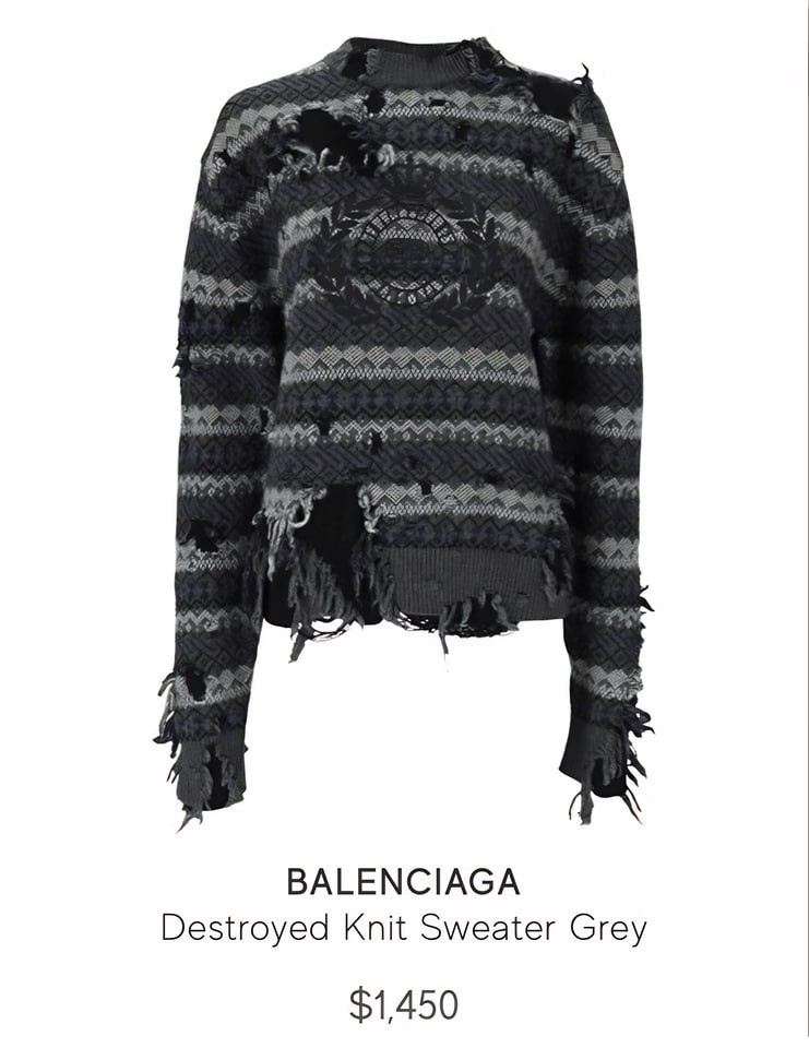 Я правда-правда не понимаю, что происходит с современной модой. Нет, есть конечно такие модельные подиумы, на которых демонстрируют вполне себе приемлемые и интересные вариации гардероба. Но в целом, в глобальном тренде какое-то сущее непотребство. И если ещё в условном "вчера" меня поражали до глубины души подвороты в морозную погоду или вездесущие маски на лице, то сегодня я и вовсе всё чаще и чаще лишаюсь дара речи, заприметив модника на улице. Ровно потому, что я реально путаюсь кто передо мной: человек с очень высоким уровнем доходов или человек без определённого места жительства. Не верите? Ну тогда "по модным трендам" и по-порядку. Карточка такого титана моды, как "BALENCIAGA". Да ещё и почти за 1,5 тысячи баксов! И ведь смотришь на этот свитер и не знаешь - то ли в нём ходил Фредди Крюгер, то ли Фредди Крюгер напал на носителя этого свитера. Но факт остаётся фактом - меня мама в детстве на огород бы даже в таком не выпустила. Сегодня же подобное рубище на каждом третьем-четвёр
