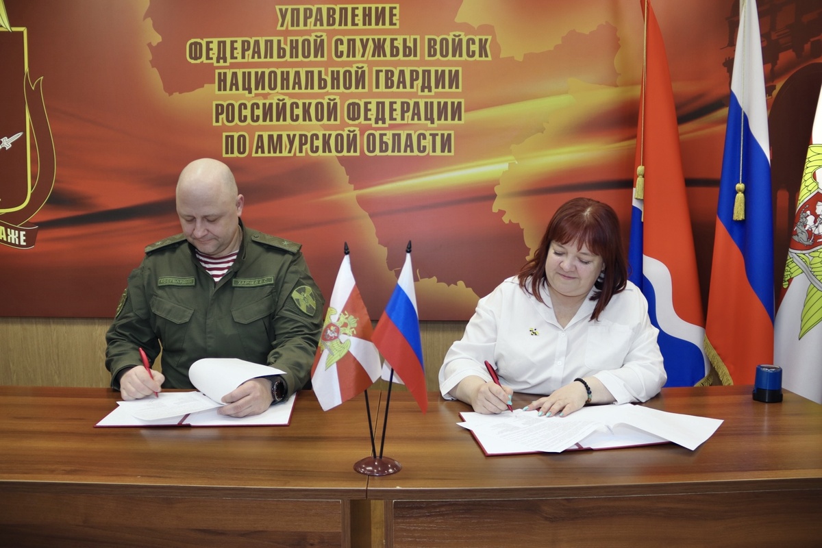 Двустороннее соглашение подписано руководителями Управления Росгвардии по Амурской области генерал-майором полиции Виталием Харчёвым и АНО ДПО «Амурского центра опережающей профессиональной подготовки» Анной Ворониной.
