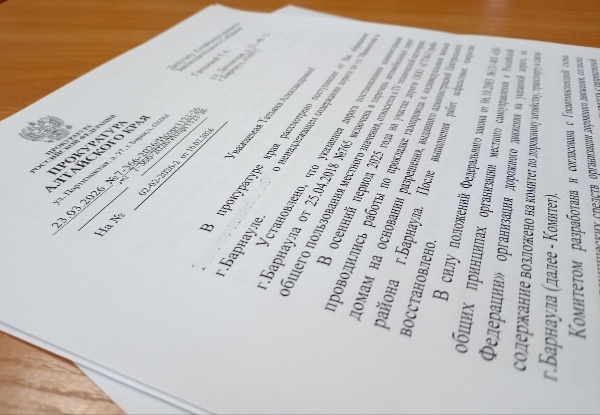 Мамонтова. В связи с ненадлежащим содержанием дороги к депутату обратилась жительница одного из домов по улице Мамонтова. Осенью 2025 года там прокладывали газопровод. После проделанной работы асфальтовое покрытие было восстановлено, но на некоторых участках остались дефекты в виде выбоин. После запроса Татьяны Грошевой в прокуратуру председателю городского комитета по дорожному хозяйству вынесено представление. А в весенне-летний 2026 года период МБУ «Автодорстрой» запланированы ремонтные работы. Кроме того, Министерству транспорта Алтайского края предложено разместить комплекс видеофиксации на участке дороги в границах улицы Челюскинцев и переулка Пороховой Взвоз в связи с неблагоприятной дорожно-транспортной ситуацией. Также МВД предложено организовать контроль движения грузовых автомобилей более 10 тонн, проезд которых ограничен.