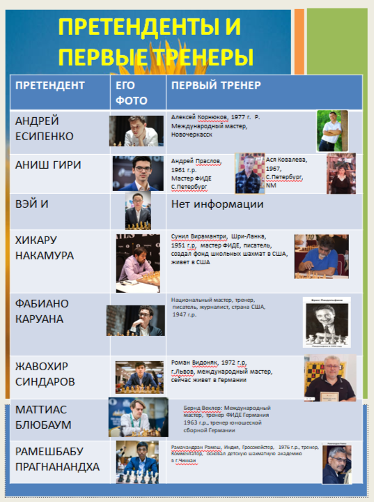 Сейчас вовсю идут сражения на ТУрниреи претендентов 2026 года. Возможно кто- то из них станет следующим Чемпионом мира. Интересно, кто научил этих ребят играть в шахматы. Вот что удалось найти в интернете: Хочется статью закончить отрывком из стихотворения А.С.Пушкина: Товарищ, верь: взойдёт она,