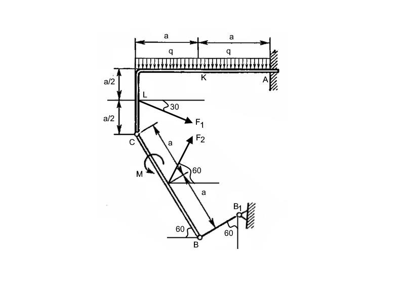 a = 0.8 м, F1 = 24 кН, F2 = 32 кН, М = 24 кН*м, q = 26 кН/м
