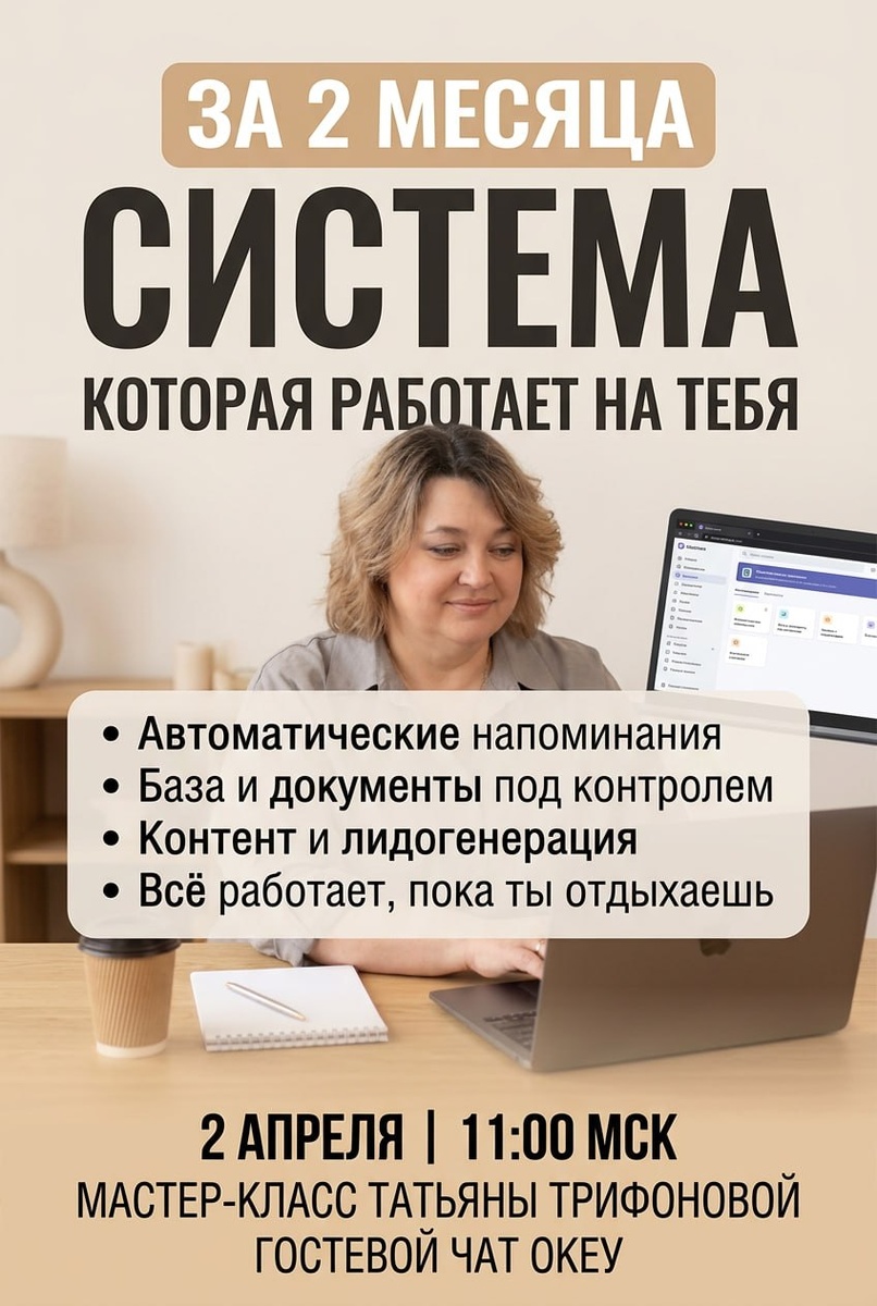 Представьте: вы — финансовый советник. Клиенты есть, знания есть, желание расти — тоже. Но каждый день превращается в хаос. Чаты горят, договоры теряются, встречи забываются, а про лидогенерацию остаётся только мечтать. Всё держится на вас. Узнали себя? А теперь представьте, что через 60 дней у вас появляется система, которая: ✅ Сама напоминает клиентам о встречах ✅ Ведёт базу и хранит документы ✅ Генерирует контент и привлекает новых клиентов ✅ И всё это — пока вы отдыхаете Это не фантазия. Это реальный опыт Татьяны Трифоновой. 2 апреля в 11:00 МСК приглашаем на мастер-класс-отчёт. Подведём итоги двухмесячного эксперимента: Татьяна с нуля настроила Океу под свой бизнес. Без теории. Только живой путь: 🔥 С чего начинали — хаос, стресс, всё в ручном режиме 🔥 Какие трудности были самыми жёсткими — честно о том, что не получалось и где хотелось всё бросить 🔥 Ключевые инсайты — моменты «Эврика!», которые перевернули всё 🔥 К чему пришли — как выглядит автоматизированный бизнес Тать