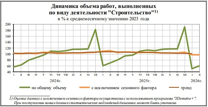 🏡 Объем работ, выполненных по виду деятельности "Строительство", в феврале 2026 г. составил 925,1 млрд.₽, или 86% (в сопоставимых ценах) к уровню соответствующего периода предыдущего года, в январе-феврале 2026г. - 1 702,6 млрд.₽, или 85,1%. 🏙 В рамках жилищного строительства в феврале 2026г. (в январе-феврале 2026г.): 🏗️ возведено 631 (1,5 тыс.) многоквартирных дома 🏠 населением построено 32,5 (75,1) тыс. жилых домов 👨👩👧👦 всего построено 73,4 (162,6) тыс. новых квартир 📊 Общая площадь жилых помещений в построенных индивидуальными застройщиками жилых домах составила 10,3 млн.м², или 69,6% от общего объема жилья, введенного в январе-феврале 2026 года 📀 Скачать отчет Росстата "Социально-экономическое положение России" за январь-февраль 2026 год 📆 Следующий доклад за январь-март 2026 года - 29.04.2026 Ввод жилья в России: ➡️за 2025 год - 108,1 млн.м² ➡️за 2024 год - 107,8 млн.м² ➡️за 2023 год - 110,44 млн.м² (рекорд) #Прогнозы_Статистика Экспертиза смет: в MAX 📲 | в Д