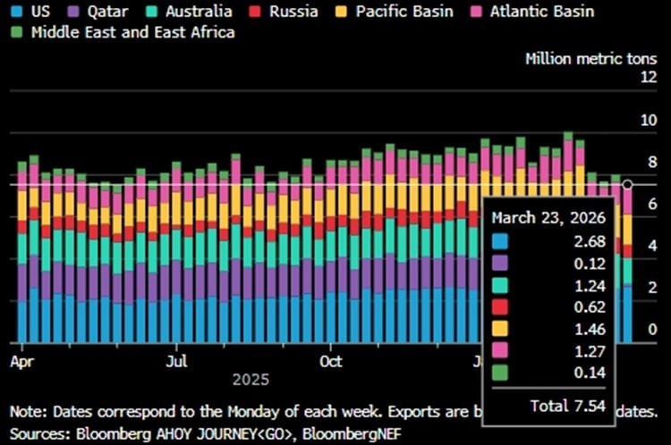 Мировые поставки сжиженного природного газа с 23 по 29 марта сократились на 6% по сравнению с предыдущей неделей, составив 7,5 млн метрических тонн, что является самым низким уровнем с конца мая 2025 года. Экспорт из Австралии снизился на 0,4 млн тонн, или на 26%, поскольку предприятия в Западной Австралии приостановили работу во время циклона. От снижения мирового экспорта, уже традиционно, выигрывает только США – единственные, кто повысил объемы отгрузок. Экспорт СПГ из России составил 0,62 млн тонн на отчетной неделе. Это худшая неделя в марте. В предыдущие 3 недели экспорт составлял 0,83, 0,63 и 0,76 млн тонн соответственно @geonrgru | 🇷🇺 MAX | sponsr.ru