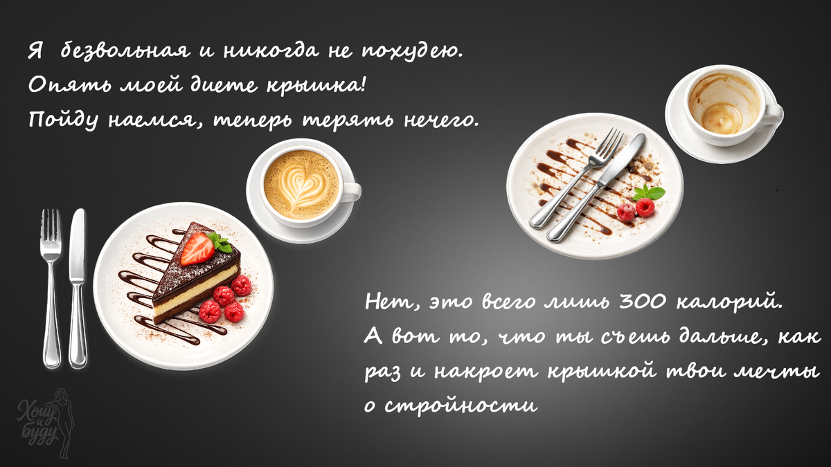 Всё делается временно: «Ну что, я месяц что ли не выдержу? Потерплю ради цели, а потом диета закончится и начнется жизнь».