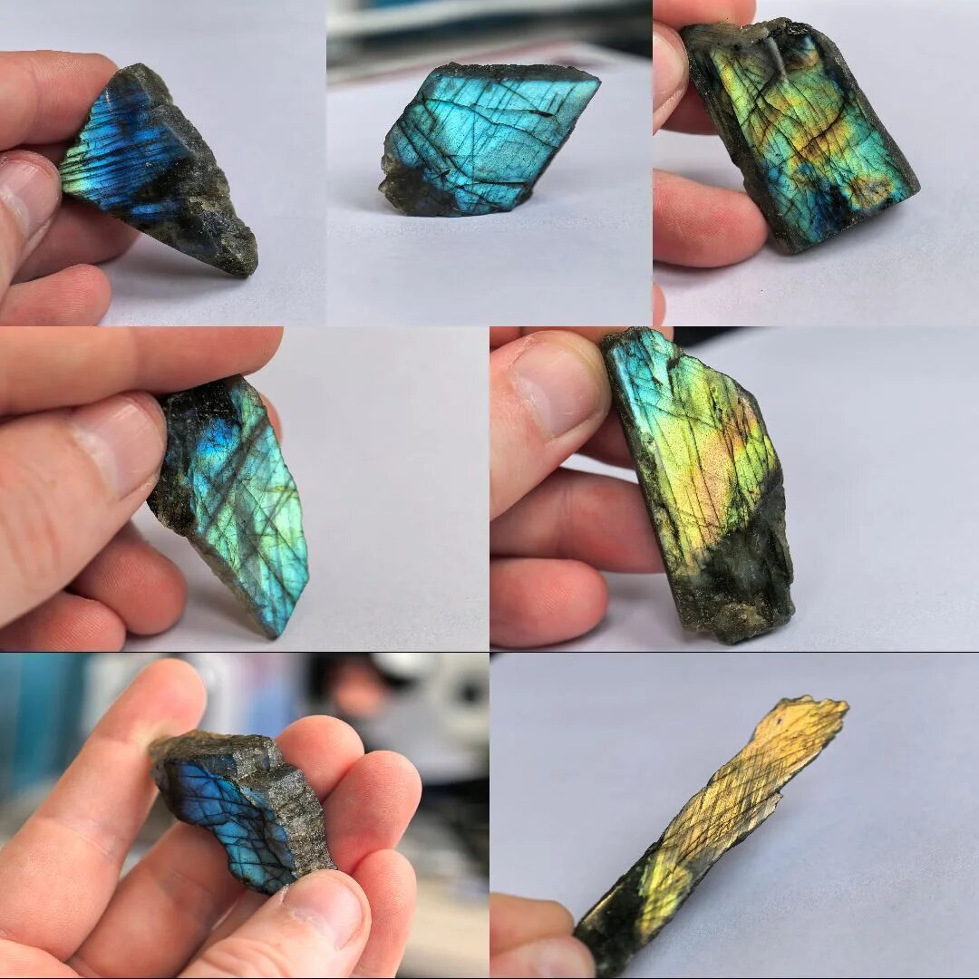 Когда в описании указан Мадагаскар, многие уже ожидают хорошую иризацию и богатую палитру на полированной поверхности. На этих фото такое ожидание подтверждается: среди семи кусочков есть сине-голубые, бирюзовые и золотисто-зелёные варианты, и у каждого — свой рисунок света.