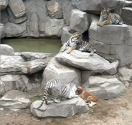 В вольере лабрадор наконец устроился в тени большого камня. Белый хищник тут же лёг рядом, прижавшись боком к собаке. Второй белый пристроился с другой стороны. Рыжие улеглись у её лап. Получилась удивительная картина – небольшая собака в окружении четырёх огромных полосатых тел.