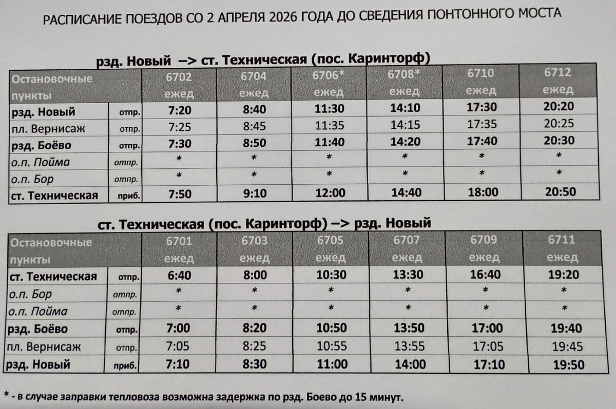 «Музей железной дороги» помогает жителям Каринторфа добраться до дома. На время паводка рейс из Кирово-Чепецка в Каринторф будет отправляться в 20:20. То есть на час позднее, чем при обычном расписании. Годами проверено, что это оптимальное время, чтобы все желающие успели на него сесть. Расписание будет действовать до открытия наплавного моста. Которое зависит не только от прохождения паводка, но и от восстановления моста после повреждений в начале зимы.