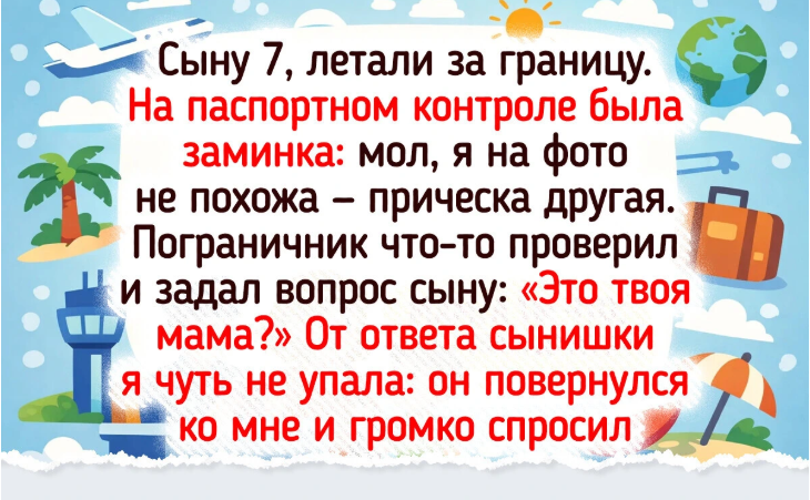 - Сыну 7, летали за границу. На паспортном контроле была заминка: мол, я на фото не похожа — прическа другая. Пограничник что-то проверил и задал вопрос сыну: «Это твоя мама?» От ответа сынишки я чуть не упала: он повернулся ко мне и громко спросил: «Надо сказать „да“?» В отпуск мы все-таки улетели, но эту историю никогда не забудем.