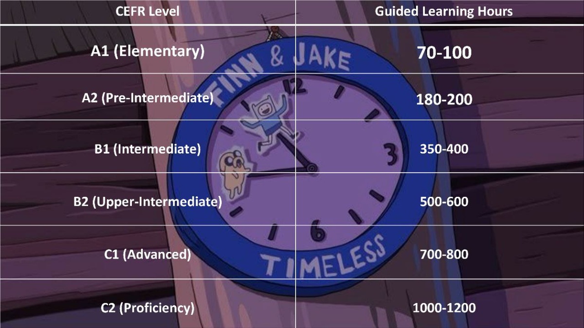 Периодически в инфополе всплывают обещания вроде "с нуля до C1 за год" или "новый уровень за 3 месяца". Звучит красиво. Примерно как зарплата "до миллиона"* *при условии, что вы работаете 25/8, за себя и за ещё пол-отдела. Теоретически такие рывки возможны. Практически - это либо исключительные случаи, либо результат с очень сильно подшаманенными замерами. Про способы "показать красивый результат", кстати, завтра опубликую отдельный разбор. Важно: это расчёт с нуля, и это не календарное время, а именно часы с преподавателем (к ним нужно плюсовать самостоятельную работу). Как это выглядит в реальной жизни 2 раза в неделю по 1,5–2 часа (=3–4 guided hours) и после каждого занятия делать 2–3 часа домашней работы. Курс на один из начальных уровней включает около 100 guided hours. Итого: 25-33 недели на курс, если без пропусков. Для сравнения: учебный год в школе = 34-37 недель. В таком ритме: Начальные уровни обычно идут быстрее: при интенсивной и регулярной работе с нуля до A2 можно дойти