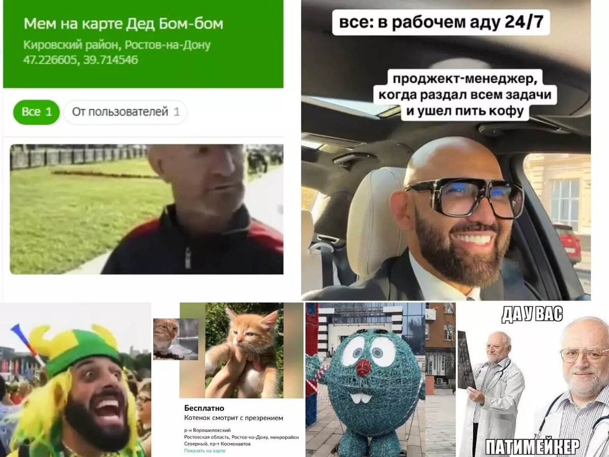 В Ростове на онлайн-карте начали отмечать адреса, по которым родились популярные мемы. Местные и гости города теперь могут найти не только достопримечательности, но и географические истоки культовых интернет-шуток. Сейчас на карте Ростова в сервисе 2ГИС отмечены два культовых персонажа. Первый — «Дед Бом-бом», точка которого находится на карте возле дома № 110 по улице Максима Горького. Согласно городским легендам, пожилой философ из Тулы по имени Михаил Мартынов именно там столкнулся с журналистом, снимающим репортаж о погоде в 2011 году. Тогда и родилась знаменитая фраза «Если сегодня ясно, значит, завтра будет бом-бом!», а также вирусные реплики про индейца и француза. Михаила не стало в 2018 году, но в сети его цитируют до сих пор. Особенную популярность образ туляка имеет на родине. Второй мем отмечен на проспекте Чехова, 45. Это улыбчивый бизнесмен Николай Василенко. Осенью 2024 года ресторатор вдруг стал настоящим прорывом в сети. В своих роликах он ослепительно улыбается и жела