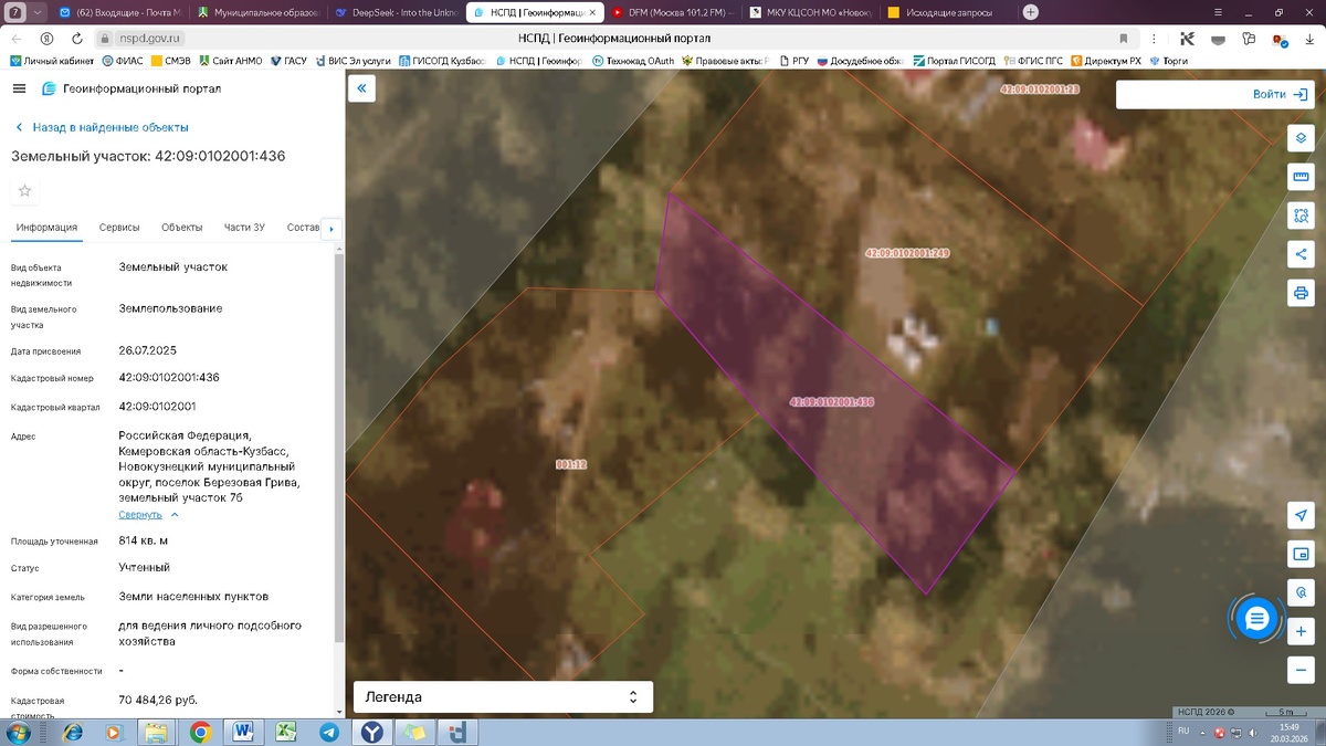 Название: Земельный участок с кадастровым номером 42:09:0102001:436 площадью 814 кв