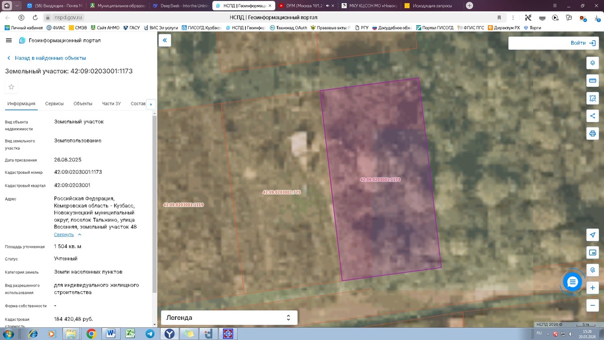 Название: Земельный участок с кадастровым номером 42:09:0203001:1173 площадью 1504 кв