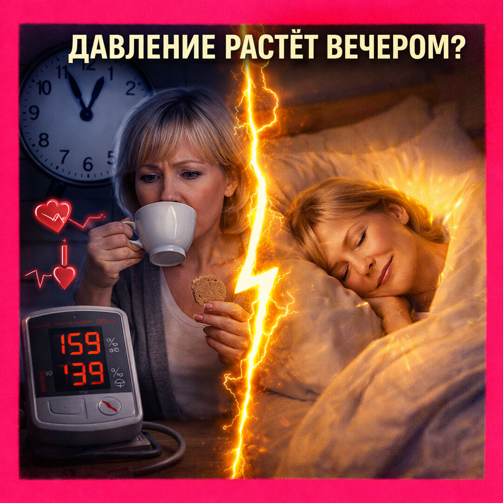 с конфетами Кажется — обычный семейный вечер. Уютный. Тёплый. Безопасный. Но именно он часто становится скрытой причиной скачков давления. Вечером организм работает иначе. После 18–19 часов: снижается скорость обмена веществ