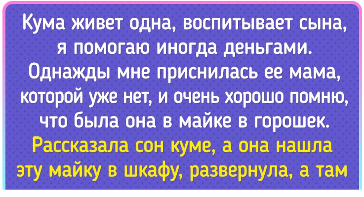- Кума живет одна, воспитывает сына, я помогаю иногда деньгами. Однажды мне приснилась ее мама, которой уже нет, и очень хорошо помню, что была она в майке в горошек. Рассказала сон куме, говорю: «Была у мамы майка такая или нет?» Вроде, говорит, была, ну и ладно. Потом кума нашла эту майку в шкафу, развернула, а там деньги спрятаны. Мамина заначка, видимо. Вот так и пригодились как раз в нужную минуту. © Татьяна Рудоман / AdMe
