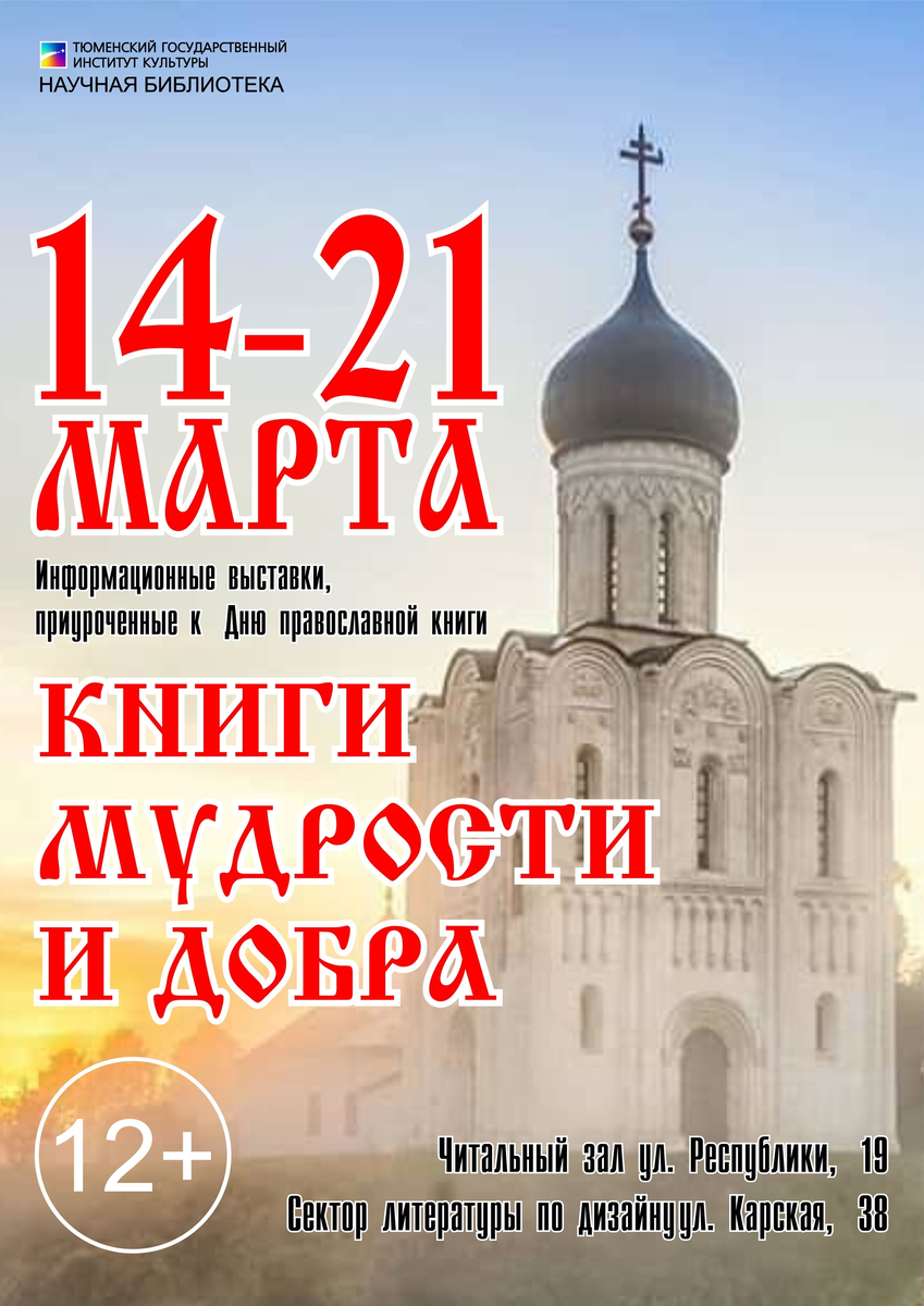14 марта в двух подразделениях научной библиотеки ТГИК – в читальном зале (ул. Республики, 19), а также в секторе литературы по дизайну (ул. Карская, 38, ауд. 302) – открылись информационные выставки «Книги мудрости и добра», приуроченная ко Дню православной книги (14 марта). 12+