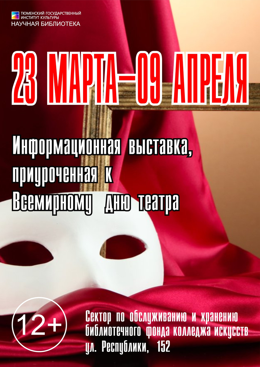 В читальном зале колледжа искусств (ул. Республики, 152, ауд. 1103) научной библиотеки ТГИК открыта информационная выставка, приуроченная к Всемирному дню театра 27 марта. Всемирный день театра был учрежден в 1961 году Международным театральным институтом (ITI). Он ежегодно отмечается 27 марта центрами ITI и международным театральным сообществом. В честь этого события организуются различные национальные и международные театральные мероприятия. Одним из наиболее важных является распространение послания ко Всемирному дню театра, в рамках которого по приглашению ITI известная личность делится своими размышлениями на тему «Театр и культура мира». Первое послание ко Всемирному дню театра было написано Жаном Кокто в 1962 году. С тех пор каждый год 27 марта (дата открытия сезона «Театр наций» 1962 года в Париже) Всемирный день театра отмечается различными способами центрами ITI, которых сейчас насчитывается более 90 по всему миру. Кроме того, его отмечают театры, театральные профессионалы, лю