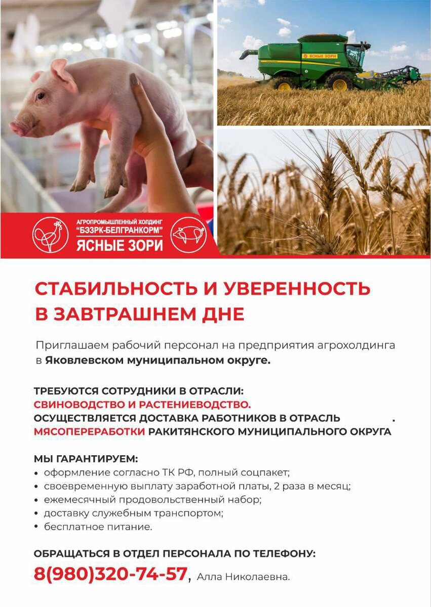 ! Весна - это пора добрых вестей и перемен к лучшему. Если кто-то из ваших родственников или знакомых остался без работы, станьте для них тем самым человеком, который принесёт хорошую новость ⬇️ Рады видеть новых сотрудников в дружной команде агрохолдинга «БЭЗРК-Белгранкорм». Работа рядом с домом, стабильная зарплата и поддержка большой корпоративной семьи. ☎️ Просто позвоните в отдел персонала, и вам ответят на все вопросы: 8 (980) 320-74-57 Также имеются вакансии в Ракитянском, Белгородском и Шебекинском муниципальных округах. Новая работа уже ждёт вас! Вакансии, ООО «Белгранкорм», ИНН 3116003662 Текст предоставлен компанией
