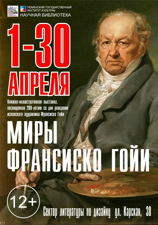 1 апреля в секторе литературы по дизайну (ул. Карская, 38, ауд. 302) научной библиотеки ТГИК открывается книжно-иллюстративная выставка «Миры Франсиско Гойи», посвященная 280-летию со дня рождения испанского художника Ф. Гойи (1746–1828). 12+