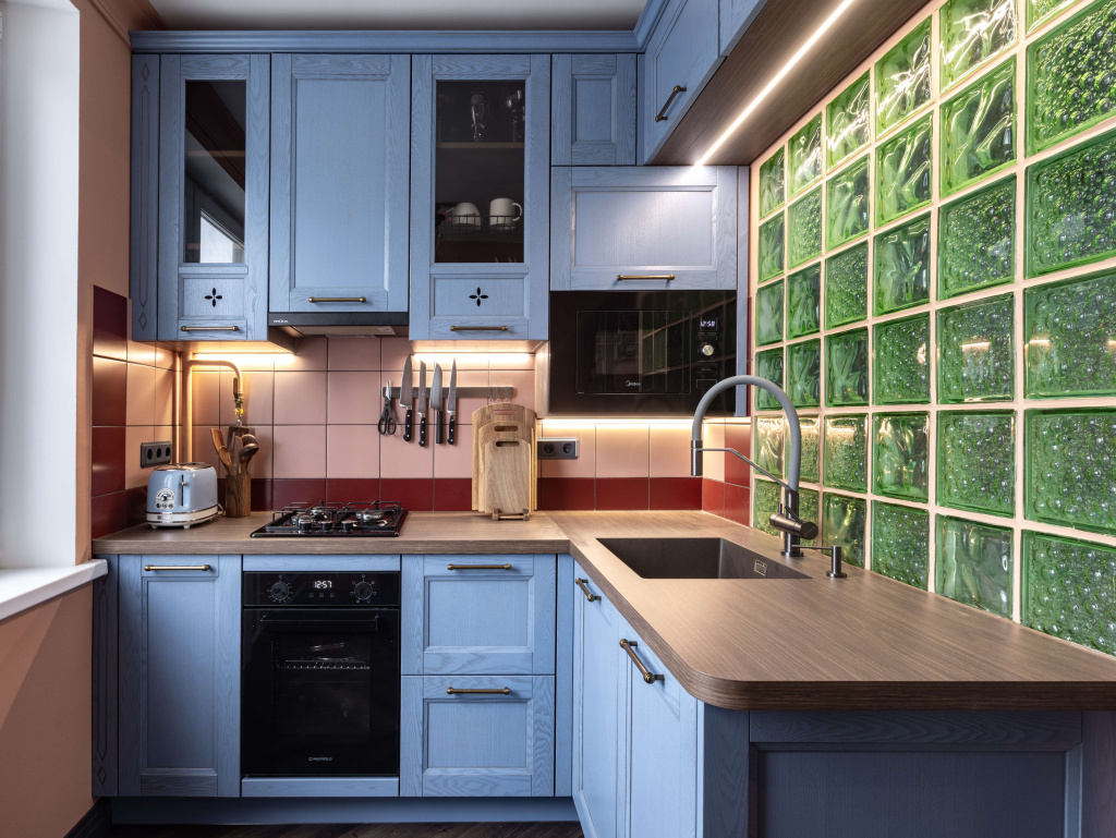 Потом мы с женой пошли по салону, и она мне говорила: мне нравится вот то, вот это. А я просто глаз не мог оторвать от этой кухни, говорю: «Маша, она такая красивая, давай возьмем?». Жена сомневалась, что к нашим стенам голубая кухня подойдет. Но она идеально подошла! Все потертости состаренного дерева повторяют оттенок стен, и кухня выглядит сказочной в нашей розово-зеленой квартире.