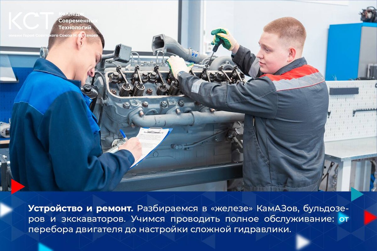 🏗️ 🛻 На этой неделе мы заглянули в мастерские к тем, кто заставляет двигаться огромные краны, экскаваторы и КАМАЗы. Мы говорим о специальности — «Техническая эксплуатация подъемно-транспортных, строительных, дорожных машин и оборудования». Чем занимаются ребята? Они — инженеры-практики, которые знают каждый винтик в многотонной технике. Студенты учатся диагностировать, ремонтировать и обслуживать машины, без которых невозможно представить ни одну современную стройку или ремонт дорог. В карточках показали, как проходят будни наших студентов на практических занятиях 🔼 А помимо диплома, выпускники получают целый набор профессиональных компетенций: ⚫️️️диплом о среднем профессиональном образовании с присвоением квалификации «Техник»; ⚫️️️свидетельство о профессии «Слесарь по ремонту дорожно-строительных машин и тракторов» 3 разряда; ⚫️️️свидетельство о профессии «Водитель погрузчика» 4 разряда или «Машинист бульдозера» 4 разряда (по выбору); ⚫️️️свидетельство о профессии «Машинист