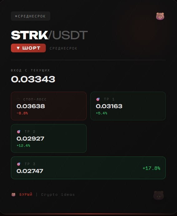 Starknet торгуется у исторических минимумов — монета упала на 99%+ с ATH в $4.41. Казалось бы, куда ещё? Но есть несколько причин, почему шорт здесь логичен. Главное — структурное давление сверху: каждый месяц 15-го числа в рынок выходит 127 млн новых токенов STRK CoinMarketCap. Ближайший анлок — 15 апреля. Это не новость, это расписание. И рынок его знает — каждый отскок продают. Технически картина та же: цена ниже всех ключевых скользящих средних, недельный и месячный сигналы на продажу. Плюс в истории проекта несколько серьёзных сбоев сети CoinMarketCap — это не добавляет доверия институционалам. Сетап среднесрочный. Не про иксы — про работу с трендом, пока он не изменился. Это мой анализ, не финансовый совет. Вход — только то, что не жалко потерять. Следите за 15 апреля — анлок покажет реакцию рынка 👇