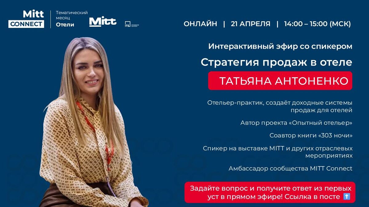 Рада стать амбассадором платформы MITT Connect — и этот эфир будет первым в новом статусе 😊 Поговорим о том, из чего складывается системная работа с продажами: аналитика, каналы, ценообразование, возвратность гостей, команда и автоматизация. У вас будет возможность задать мне вопросы — как заранее, до 17 апреля, так и в прямом эфире. Апрель на MITT Connect — тематический месяц «Отели», так что полезного контента будет много. Не пропустите! Регистрация и форма для вопросов — по ссылкам ниже. До встречи! 👉 Форма для вопросов 👉 Регистрация на эфир