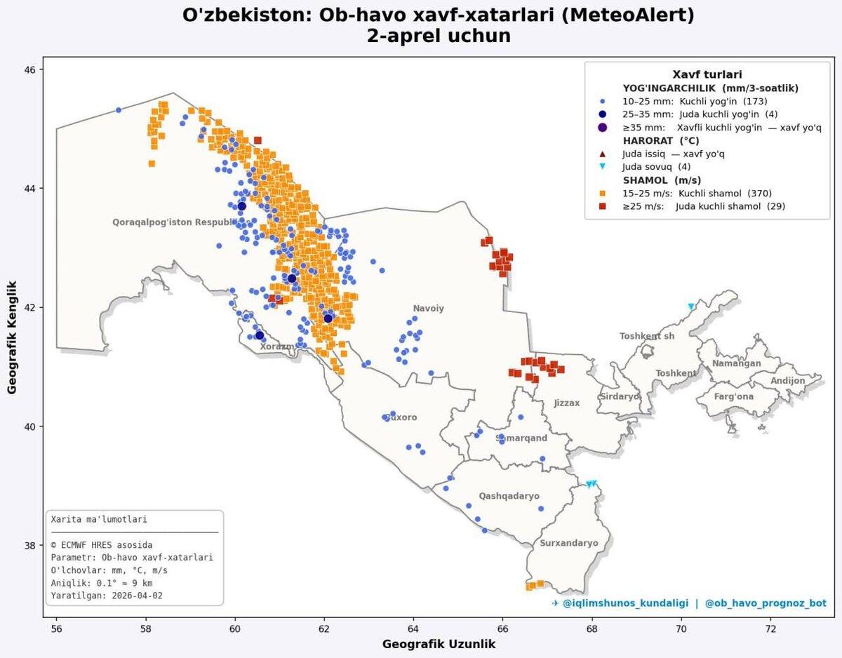 Бугун Қорақалпоғистон шарқий ва шимолий туманларида кучли шамол, Айдар–Арнасой кўллар тизими устида ҳам "қизил" хавф даражасидаги кучли шамоллар, Қорақалпоғистон ғарби, Хоразм вилояти кўплаб туманларида кўп миқдорда ёғингарчилик кутилмалари бор. Каналимизга обуна бўлинг ва энг сўнгги янгиликларни кузатиб боринг Jizzaxnews |Тelegram | Facebook | Dzen | YouTubе