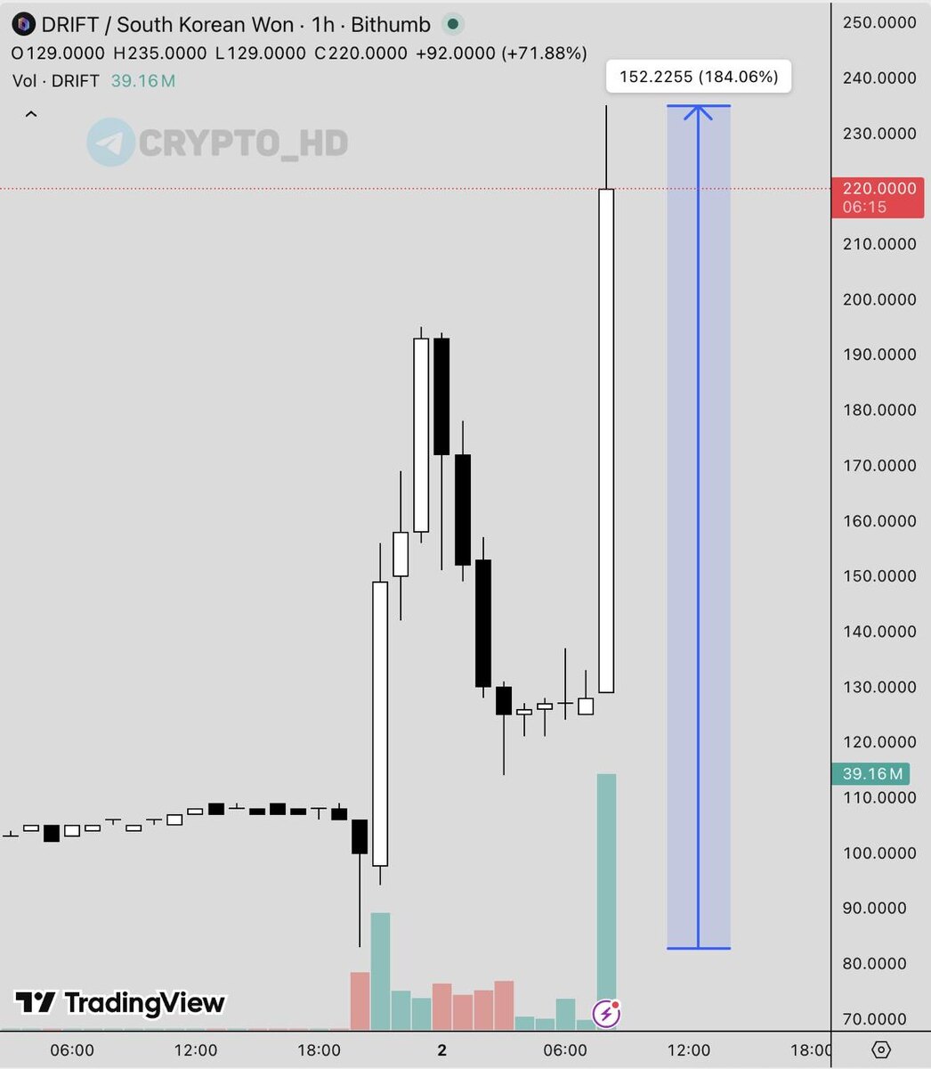 😮 Токен #DRIFT вырос на 180% на южнокорейской бирже Bithumb после взлома DeFi-протокола Drift.
