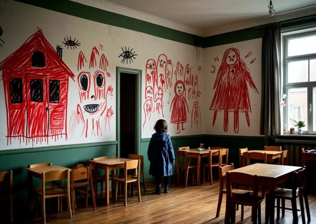 Первый детский сад 10 страшных историй Читать для взрослых 1. «Кукла из шкафчика» В младшей группе детского сада № 17 давно стоял старый шкаф с треснутым зеркалом. Воспитатели запрещали детям открывать одну из дверок — ту, что с трещиной. Но пятилетняя Лиза однажды заглянула внутрь. Там сидела кукла с фарфоровым лицом, но без глаз. На следующий день Лиза перестала разговаривать. А ночью нянечка, делая обход, увидела, как кукла медленно поворачивает голову в её сторону. Утром шкаф был пуст, а в зеркале остались царапины, будто кто‑то скреб изнутри. 2. «Тени на стене» После ремонта в спальне старшей группы на стене остались странные тени — будто силуэты детей, стоящих в кругу. Воспитательница думала, что это игра света, пока однажды ночью не услышала шёпот за спиной. Обернувшись, она увидела, что тени на стене движутся — и одна из них подняла руку, указывая прямо на неё. С тех пор воспитательница больше не ночует в садике, а дети жалуются, что ночью кто‑то трогает их за плечи. 3. «Песенк