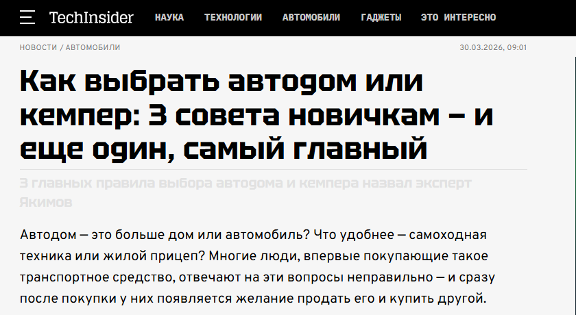 Член Общественного совета Ространснадзора Михаил Якимов о том какие автодома лучше выбирать. TechInsider, 30.03.26