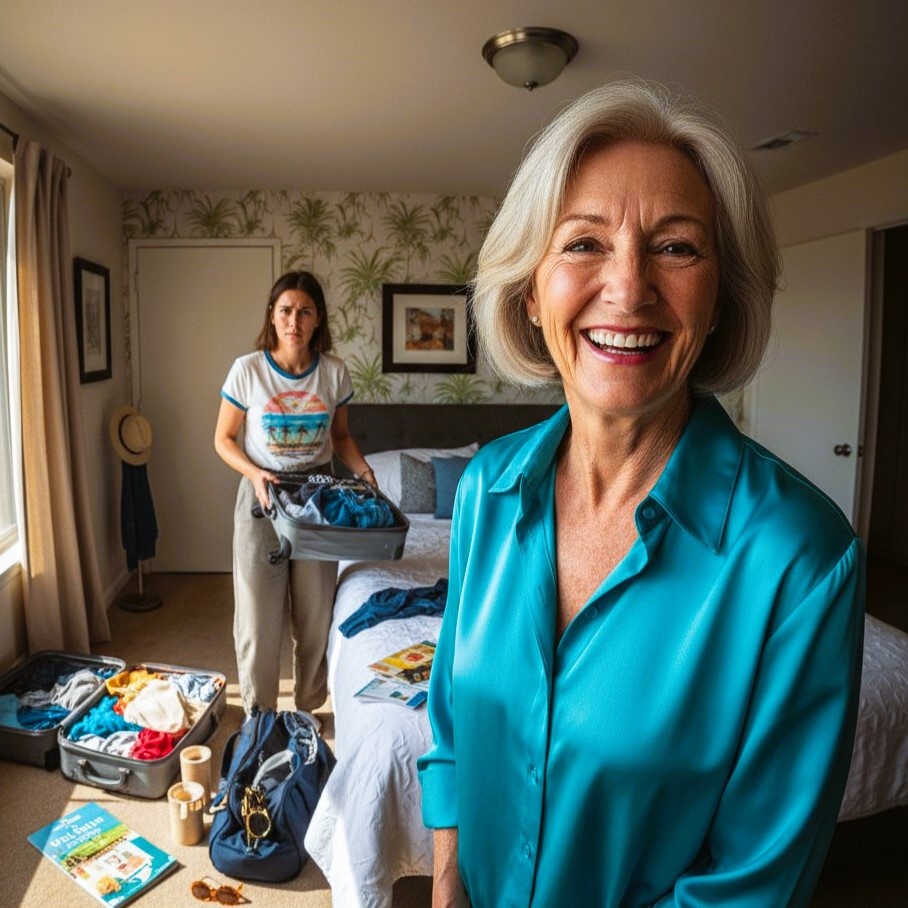 В аэропорту Тамара Сергеевна ждала их у стойки регистрации — в яркой бирюзовой блузке, с тщательно уложенными волосами, с маленьким чемоданом в цветочный принт. Она увидела их издалека и замахала рукой так энергично, словно встречала после годовой разлуки.