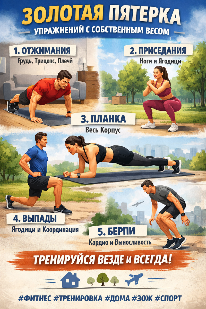 Нет времени или возможности ходить в зал? Это больше не оправдание! Существует база упражнений с собственным весом, которые прорабатывают все основные группы мышц не хуже тренажеров. Вот золотая пятерка, которую можно выполнять дома, в парке или даже в командировке.