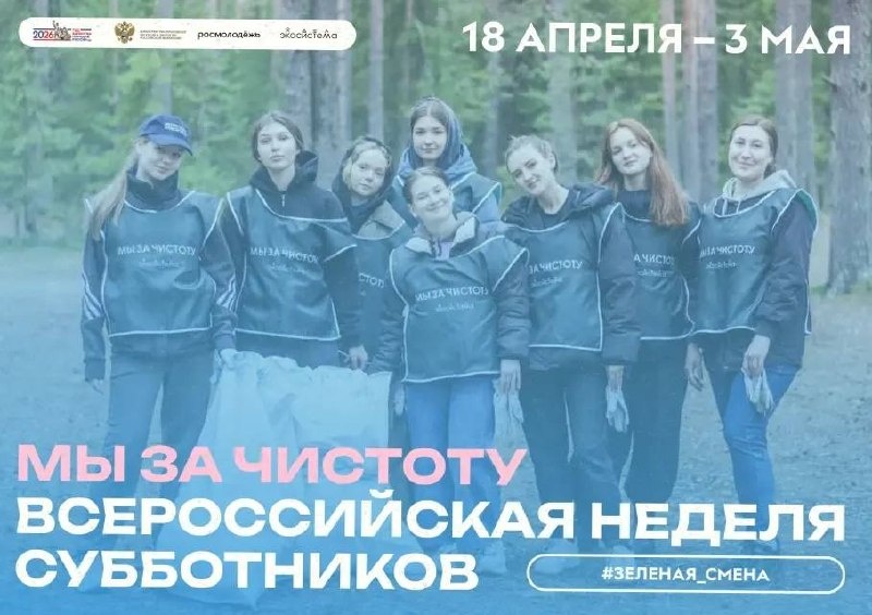 » 🧹С 18 апреля по 3 мая во всех регионах страны состоится Всероссийская неделя субботников «Мы за чистоту». Мероприятие организовано Федеральным агентством по делам молодёжи (Росмолодёжь) совместно с Всероссийским экологическим общественным движением «Экосистема». ➡️Акция приурочена к Году единства народов России и реализуется в рамках национального проекта «Молодёжь и дети». Присоединиться к инициативе может любой желающий. ✅Для участия необходимо выполнить несколько шагов: 1️⃣Заполните анкету участника на сайте экологироссии.рф 2️⃣Выберите подходящую локацию на интерактивной карте или добавьте собственное мероприятие 3️⃣Пригласите к участию друзей, коллег и родственников. 4️⃣Расскажите об участии в акции на своей странице ВКонтакте с хештэгами #МыВместеЗаЧистоту, #Зеленая_смена, #Мызачистоту, #Росмолодежь, #ДвижениеЭкосистема 📲В этом году организаторы будут выбирать лучшие публикации в двух категориях: ▪️«Было – стало»: фото или видео локации до и после субботника, где юудет