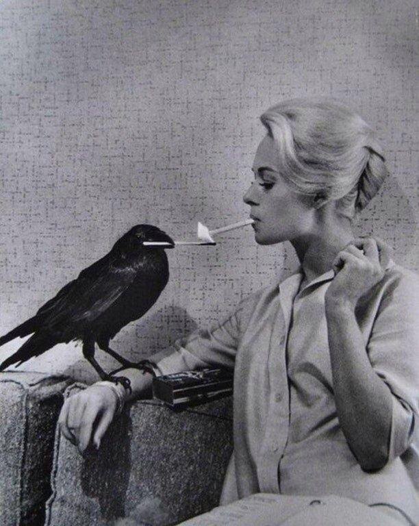 Представьте себе: Ворон, этот загадочный и умный птиц, решает зажечь сигарету для Типпи Хедрен прямо на съёмках культового фильма "Птицы" в