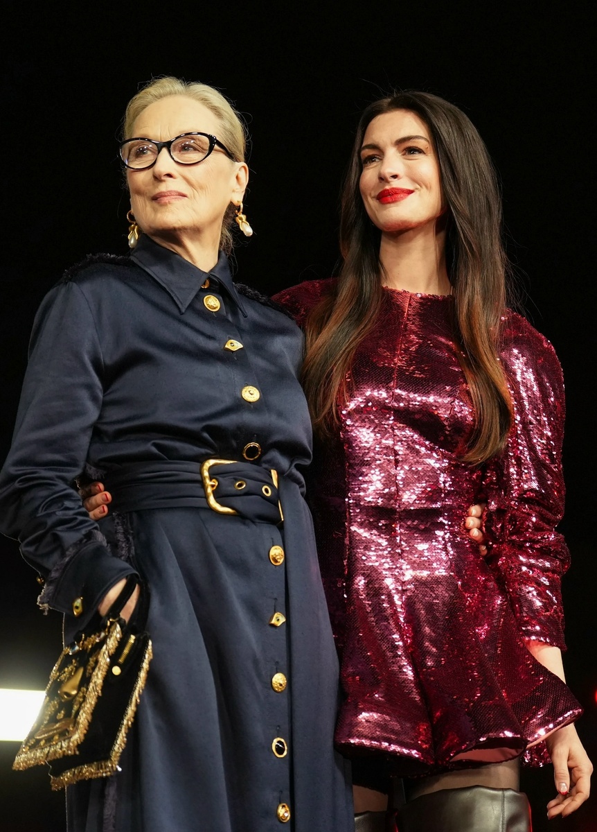 Мэрил Стрип (76 лет) для премьеры предпочла элегантный образ Schiaparelli, а для общения с журналистами — яркий красный костюм Dolce & Gabbana.