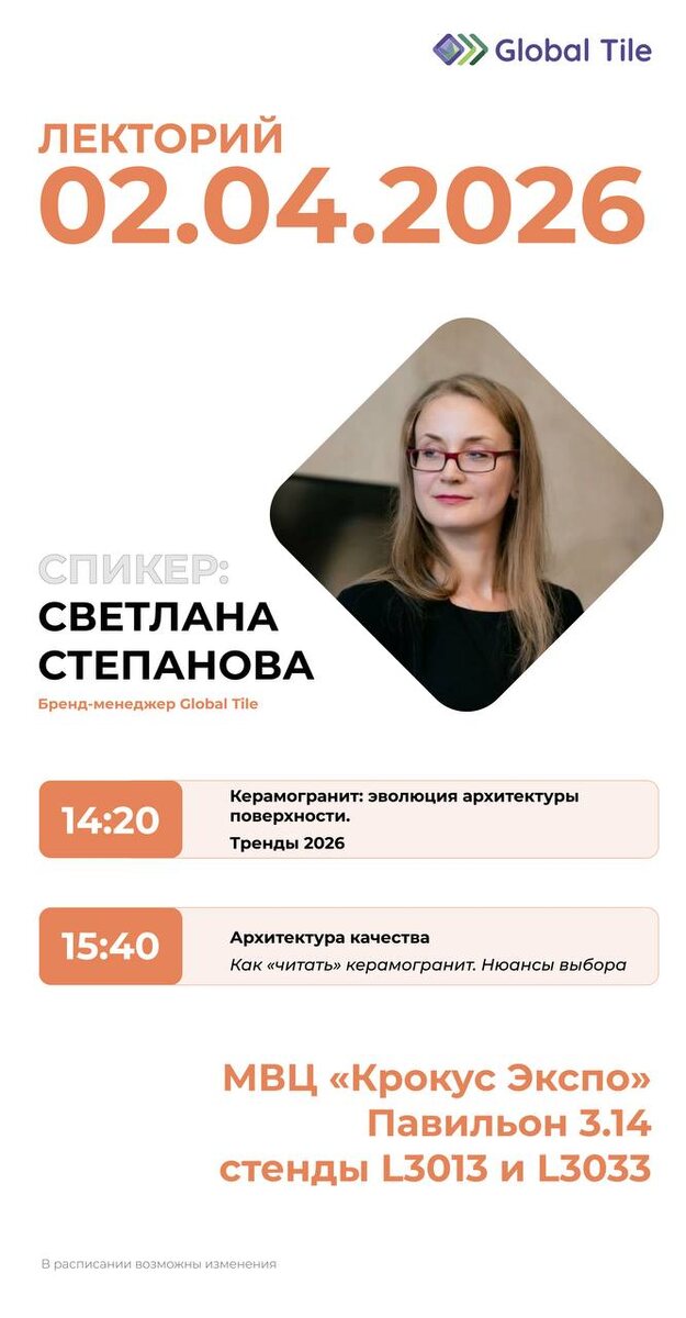 ? 🤔 Сегодня на MosBuild’26 эксперт Global Tile Светлана Степанова раскроет главные секреты и тенденции индустрии! ⏰ Когда: Сегодня в 14:20 и 15:40 📍 Где: МВЦ «Крокус Экспо», Павильон 3.14, стенды L3013 и L3033 (Лекторий «Палитра») Не упустите возможность получить экспертную информацию из первых уст! Приходите, будет очень вдохновляюще✨
