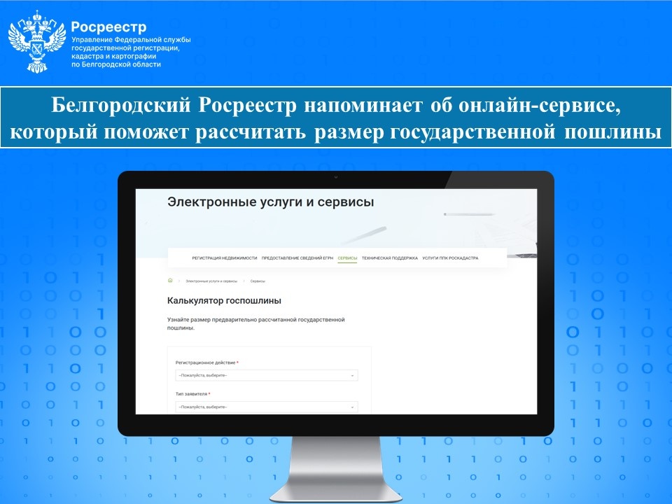 Белгородский Росреестр напоминает, что на официальном сайте Росреестра реализован бесплатный онлайн-сервис «Калькулятор госпошлины» (rosreestr.gov.ru/eservices/...), который поможет заинтересованным лицам предварительно рассчитать размер государственной пошлины за проведение учетно-регистрационных действий. Чтобы воспользоваться сервисом, необходимо: