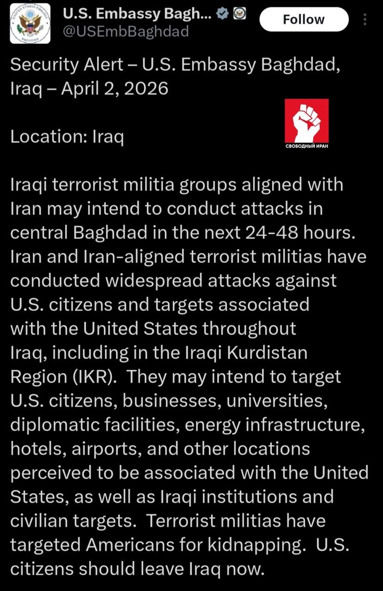 ⚠️ Посольство США в Багдаде призвало американцев покинуть Ирак: по его оценке, проиранские группировки могут попытаться атаковать центр Багдада в ближайшие 24–48 часов. Подпишитесь на канал