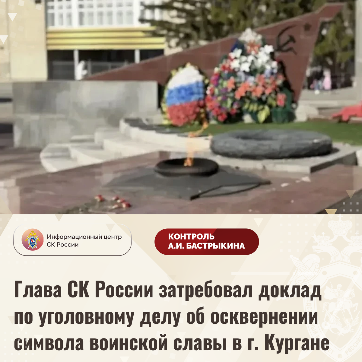 Глава СК России затребовал доклад по уголовному делу об осквернении символа воинской славы в г. Кургане В сети Интернет сообщается, что в марте текущего года жительница города Кургана совершила действия, направленные на осквернение символа воинской славы России – Вечного огня, расположенного у Обелиска Победы в память курганцев, погибших в годы Великой Отечественной войны. В СУ СК России по Курганской области возбуждено уголовное дело. Председатель Следственного комитета Российской Федерации Александр Иванович Бастрыкин затребовал у руководителя СУ СК России по Курганской области Сергея Витальевича Степанова доклад о предварительных и окончательных результатах расследования уголовного дела. Исполнение поручения поставлено на контроль в центральном аппарате ведомства. #СледственныйКомитет #СКРоссии #СК #ИЦСКР #ИнформационныйЦентр #АлександрБастрыкин #ПредседательСКР #КонтрольПредседателяСКР #КомментарийКонтроль #КурганскаяОбласть