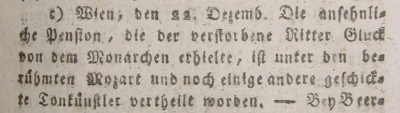 «Значительная пенсия, которую покойный рыцарь Глюк получал от монарха, была разделена между знаменитым Моцартом и некоторыми другими искусными музыкантами».
