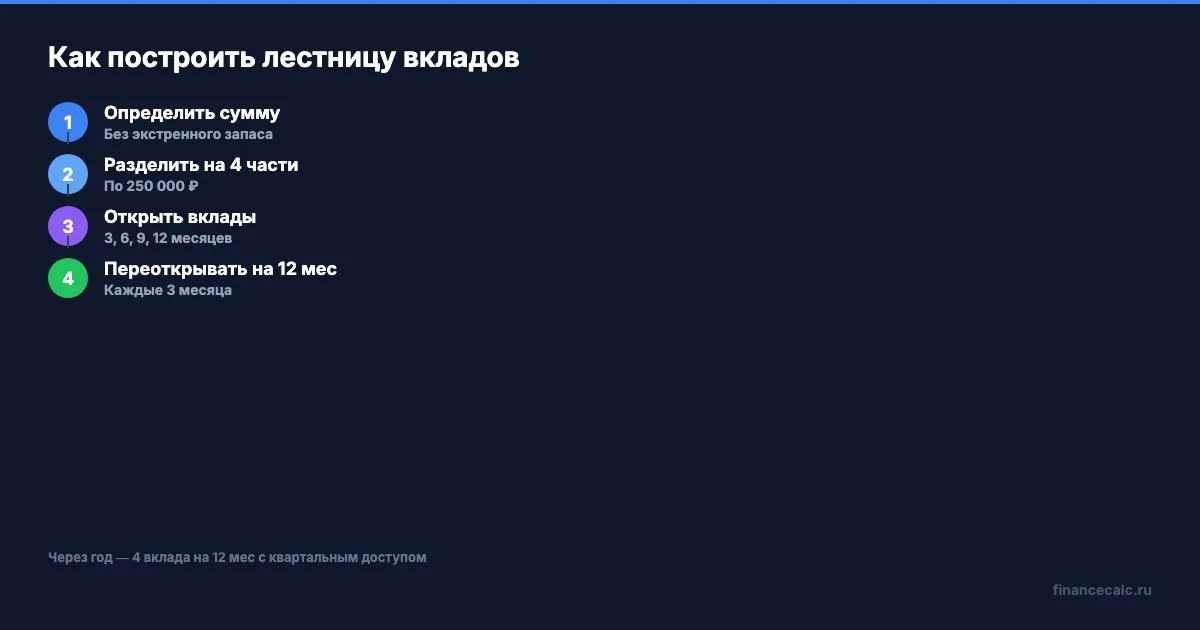 Лестница вкладов — не способ заработать больше, чем на одном длинном вкладе. Это способ не терять деньги при досрочном снятии и держать ставку на максимуме. Начните с четырёх ступеней — через год конвейер заработает в полную силу.