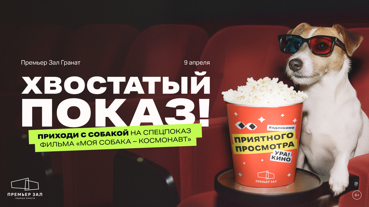 Друзья, 9 апреля нас ждет настоящий праздник. Праздник кино, дружбы и, конечно, наших любимых питомцев. «Моя собака — космонавт» — это история, которая напомнит нам, что подвиги рождаются из любви, а самые верные друзья иногда ждут нас просто на улице. Приходите в кинотеатры «Премьер Зал» всей семьей, берите с собой хвостатых (только 9 апреля в «Премьер Зал Гранат») и не забудьте про вкусный попкорн (Том Ям или Дубайский шоколад — на ваш выбор!).