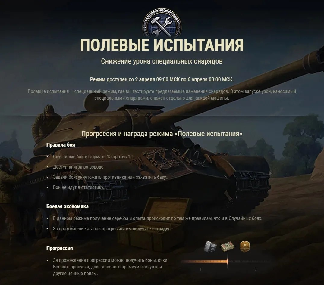 🛠 Погнали в Полевые испытания — будем тестировать "голду" с уменьшенным уроном и получать за это неплохие награды! ㅤ 👇 Самое важное: • Это отдельный игровой режим, который будет доступен только на RU1 по 6 апреля, • Урон специальных снарядов снижен на 15%, • Забираем 3 контейнера «Зов сокола» за победу в 30 боях за всё время действия режима, • Можно фармить очки БП в ежедневной прогрессии и с помощью специальной задачи, • Испытания будут проходить на 24 специальных танках и ПТ-САУ X уровня с неснимаемым экипажем. ㅤ 👉Ранее писали...