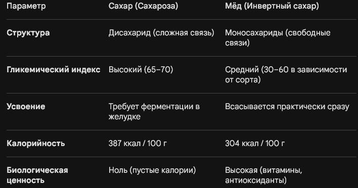 Мёд — это уже «разжеванная» энергия. Пчелы-инженеры с помощью фермента инвертазы уже расщепили сложные связи.
